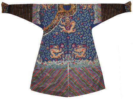 Parmi les nombreux trésors collectés par les deux galeristes, on trouve ainsi un manteau de cour des empereurs mandchous, le Chi Fu, un paletot aux manches évasées finement brodé de fils d'or sur soie jaune. A la cour de Pékin, seul le fils du ciel était autorisé à porter la couleur du soleil agrémentée de l'emblème du dragon, décliné en neuf broderies, sur tous les pans de son vêtement, envers compris.