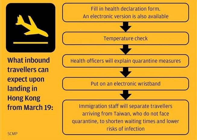 En vigueur depuis le 19 mars minuit, suite à la recrudescence de cas importés (50 sur les 57 nouveaux cas depuis 15 jours), Hong Kong met toutes les personnes arrivant sur le territoire sous quarantaine (14 jours) à leur domicile. Ils devront ensuite se soumettre à 15 jours de surveillance médicale. Seuls les voyageurs en provenance de Taiwan, bon élève de l’Asie, seront exemptés. Chacun devra porter un bracelet électronique connecté à une application mobile. La géolocalisation permettra de s’assurer que les personnes restent chez elles.
