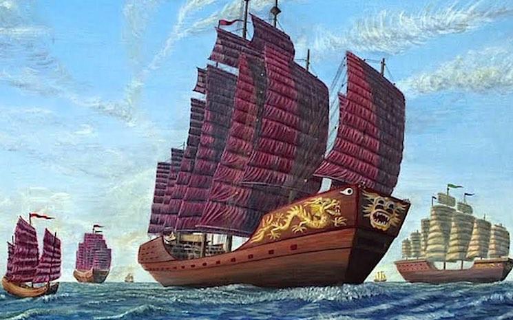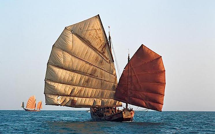 Le développement de la navigation en Chine n’est pas si ancien que cela. En effet, la population s’est longtemps consacrée au développement autour des deux grands fleuves et n’a entrepris les échanges maritimes que tardivement. Si la célèbre expédition de Zheng He (1371-1433) vers les côtes africaines est restée gravée dans les mémoires, c’est surtout au XVIeme siècle que s’établissent en Asie des lignes commerciales régulières et avec elles la construction de bateaux robustes capables de transporter des marchandises dans leurs cales compartimentées. La jonque, dont le nom vient du malais "djong" via les Indes Néerlandaises avec lesquelles la Chine a de nombreux échanges, se caractérise par sa construction en bois, de forme ventrue pour assurer un tirant d’eau suffisant et sa célèbre voilure faite de toile de coix lacryma, une feuille cultivée au sud de la Chine, renforcée par des lattes de bambou. C’est cette voilure à nervures qui décorera pendant plusieurs siècles les différentes côtes et ports d’Asie. L’essentiel de la fabrication des voiles se fait dans le Guangdong et le Fujian produisant les fibres de feuilles utilisées pour les jonques. Les sampans ont ceci de différent des jonques que leur fond est plat, leur usage étant limité à la navigation côtière et le cabotage. Ils utilisent en revanche le même type de voilure.