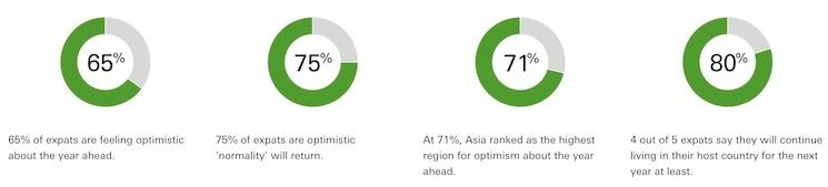 Selon la nouvelle étude HSBC Expat Explorer, 65% des expatriés sont optimistes pour l'année à venir, et ce malgré la volatilité des 18 derniers mois. Pour l’Asie, ce score est de 71%. La principale raison de cet optimisme est l'espoir des expatriés de vivre à nouveau « normalement » (75 %), 61 % étant également positifs quant à la qualité de vie dont ils pourront profiter. Sur ce critère, les expatriés à Taïwan sont les plus optimistes (85 %), suivis de près par ceux d'Australie, de Nouvelle-Zélande et du Vietnam (tous 83 %).