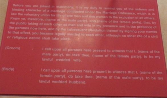 Enfin la dernière possibilité est de célébrer son union dans un Marriage Registry. Les mariés et les deux témoins doivent se présenter avec leurs Hong Kong ID ou passeports. Une cérémonie en semaine coûte 715 HKD et 1935 HKD le weekend. Elle est présidée par un représentant de l'immigration et dure une dizaine de minutes. Les mariés prononcent leurs v?ux et signent le certificat de mariage. Il est possible de rester brièvement dans la salle pour prendre des photos mais pas d'y organiser une réception.