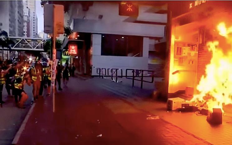 Des barricades, enflammées pour une partie, seront successivement érigées à Causeway Bay, Wan Chai puis sur Harcourt Road près du LegCo. Vers 17:00, des cocktails Molotov sont lancés sur le bâtiment du gouvernement, déclenchant une réaction musclée de la police anti-émeutes. Des jets de briques sur Harcourt Road sont suivis par la mise en action de canons à eau puis des tirs de balles en caoutchouc et de gaz lacrymogènes. Les affrontements se poursuivront vers Wan Chai où le feu est mis à l’entrée de la station, les charges successives de la police faisant progressivement reculer les protestataires vers l’est de l’île. A 20:00, c’est le MTR de Tin Hau qui est vandalisé puis après 21:00, des militants pro-Pekin s'en prennent aux protestataires à Fortress Hill et North Point. La police finira par disperser les différents groupes à coup de gaz lacrymogènes, interpelant au passage des individus armés de couteaux. On compte alors 8 blessés pour la journée.