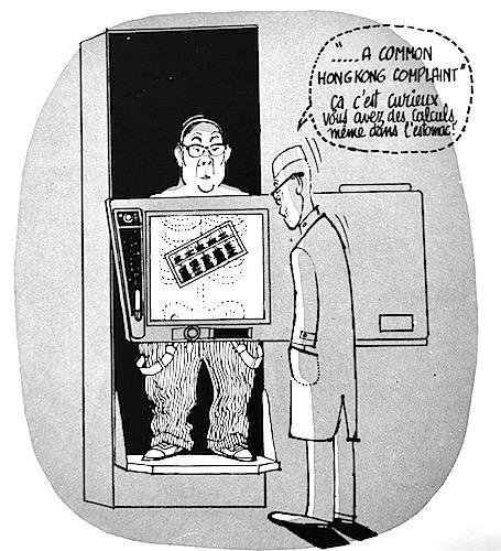 Le dessinateur Daniel Zabo a passé huit ans en Asie, venu sans un sous en poche pour faire un tour du monde. Son passage à Hong Hong correspond avec la publication de dessins humoristiques, rassemblés dans une recueil intitulé "Dollars Billets Doux". Zabo y croque des tranches de vie et nous gratifie au passage d'un témoignage instantané sur l'ambiance du Hong Kong de la fin des années 1960. C'est une période charnière, marquée par le développement de la ville et donc teintée d'optimisme, bien que les écarts de richesse et les difficultés fassent toujours partie du quotidien.
