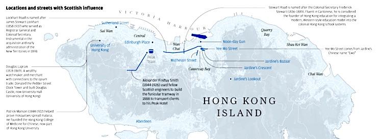 Les traces celtes sont présentes à Hong-Hong. De nombreux chemins de randonnée portent les noms des bâtisseurs écossais de l'expansion du Port aux parfums (Sir John James Cowperthwaite, Murray MacLehose, James Legge, David Clive Wilson...) tout en transportant les promeneurs dans un parfum mystérieux de vieille Ecosse des légendes. Edinburgh place, Matheson street, le funiculaire construit par l'ingénieur écossais Alexander Lindsay Smith pour rejoindre Victoria Peak, le quartier Aberdeen... D'autres noms de rues illustrent comment ces "tigres celtiques" ont voulu faire de Hong-Kong un "tigre d'Asie". Leur secret: injecter un management politique libéral dans la tradition administrative chinoise. En somme, bâtir une nouvelle Athènes en Extrême-Orient, travaillant en réseau et tournée vers l'extérieur, pionnière dans la lutte contre la corruption, l'efficacité des affaires et en pointe de matière de lutte contre les maladies tropicales comme la malaria par exemple.