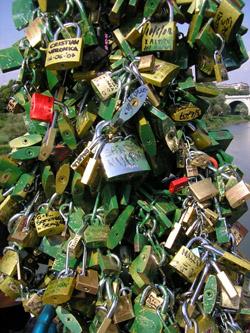 Petit, moyen ou grand, Ce pourrait être la chanson de geste d'un cadenas romain. Tant on en trouve sur le Ponte Milvio, qui reprend vie, comme la belle endormie, d'un baiser de cinéma. C'est un véritable phénomène qui s'est emparé de ce pont sur le Tibre, depuis les sorties du roman à succès de Federico Moccia, Ho voglia di te, et du film éponyme en 2007. Pour exprimer leur sentiment, les amoureux cadenassent et enchaînent les lampadaires du Pont Milvio, avant de jeter la clef dans le Tibre. Ce qui faisait partie de l'imaginaire de l'auteur est aujourd'hui bel et bien une réalité. Les couples se succèdent sur l'un des plus vieux pont de la capitale (- 207 avant JC) pour se jurer fidélité. Certains réverbères ont déjà croulé sous le poids, au grand dam des services municipaux. L'histoire fait recette