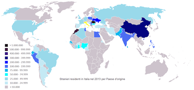 D'où sont originaires les immigrés en Italie ? (Chiffres de 2013) Roumanie : 1.072.342 Maroc : 513.374 Albanie : 497.761 Chine : 304.768 Ukraine : 224.588 Philippines : 158.308 Inde : 150.462 Moldavie : 149.231 Égypte : 123.529 Tunisie : 121.483 |