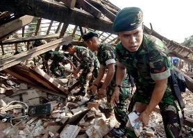 Les militaires déployés dans la région de Yogyakarta se sont efforcés hier de retrouver des survivants dans les décombres des bâtiments détruits (Photo : AFP)