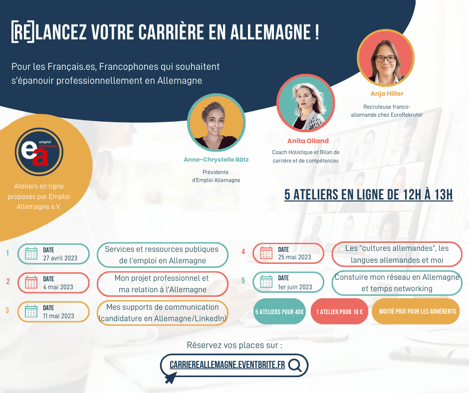 Atelier n°1 d'un cycle de 5 ateliers d'informations en ligne d'une heure dédiés au partage d'information sur la thématique "emploi et carrière en Allemagne". Ce cycle d'ateliers est proposé par l'association Emploi Allemagne e.V., association reconnue d'utilité publique.