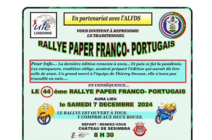 Cette année L'UFE (Union des Français de l´étranger) et l'ALFDS (Association Luso Française de Défense et de Sécurité) ont décidé de s'associer pour reprendre le traditionnel Rallye paper franco-portugais. La dernière édition remonte à 2019 en raison de la pandémie. Les vainqueurs de 2019, l'équipe de Thierry Decoux, tradition oblige, avaient préparé l'édition qui aurait dû être celle de 2020, c´est celle-ci qui sera donc reprise cette année.