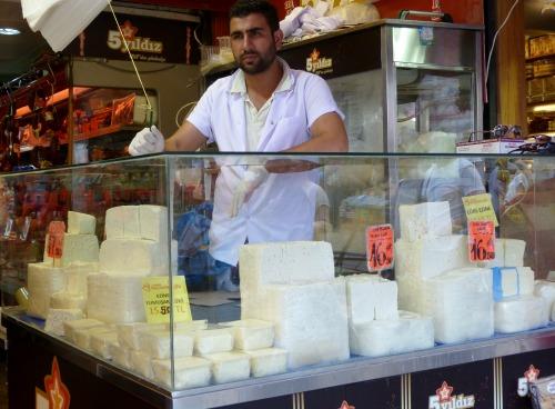 Il serait sans doute trop facile de dire qu'on y trouve de tout. Pourtant, les ruelles regorgent véritablement de marchandises diverses et variées, qui tiennent la curiosité et le regard en éveil tout au long du parcours. Les premiers mètres feront appel à vos nez et papilles. La rue qui longe le côté droit du Marché aux épices est en effet investie par des vendeurs d'aliments, avec trois dominantes : le fromage, les épices, les fruits secs. Beyaz peynir, eski ka?ar, çeçil peyniri? La majorité des fromages turcs sont représentés, et les vendeurs sont toujours prêts à vous les faire goûter. "Le fromage coûte assez cher en Turquie, car le lait coûte cher" explique Murat, qui vend des fromages depuis plusieurs années. "Les fromages à base de lait de chèvre sont plus chers que ceux à base de lait de vache" précise t-il.