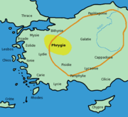 Emplacement de la région traditionnelle de Phrygie en Asie Mineure (en jaune) et expansion maximale du royaume Phrygien (en orange).Carte Wikipedia.