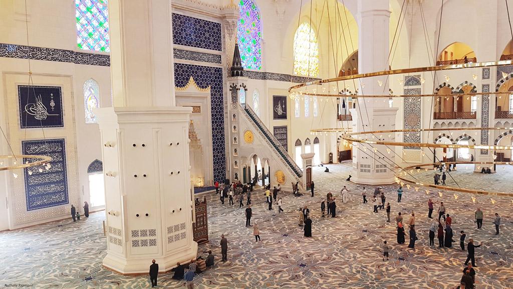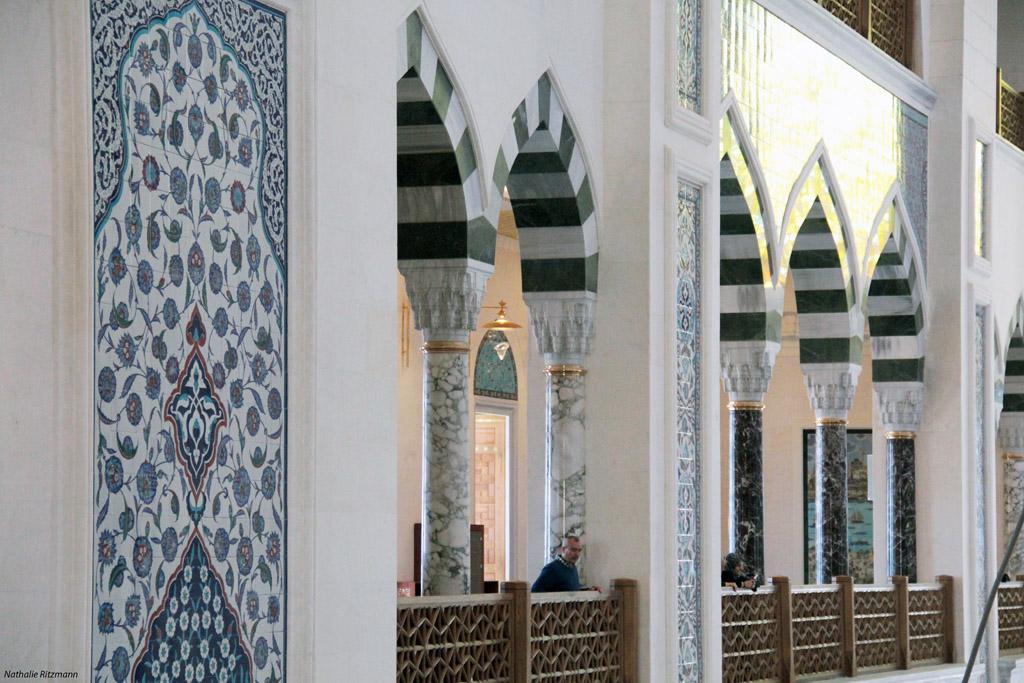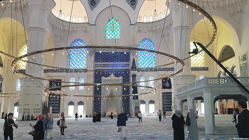 De magnifiques panneaux de faïence d'Iznik, des vitraux aux couleurs chatoyantes, des colonnes de marbre de différentes couleurs, représentent une infime partie de la décoration particulièrement travaillée de la mosquée de Büyük Çamlıca.