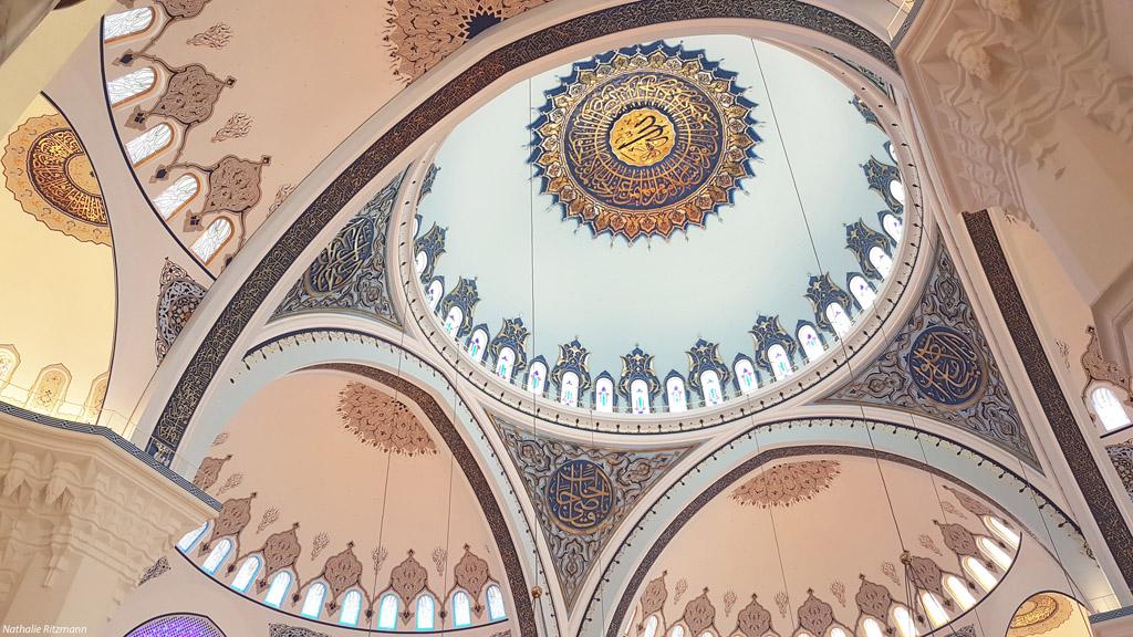 Une fois franchi le seuil de l’édifice, le regard est happé par l'immensité du lieu. Le dôme central de 34 m de diamètre se à une hauteur de 72 m, en référence aux 72 nationalités vivant à Istanbul. Sur sa surface intérieure sont symbolisés les 16 états turcs, dont les plus connus sont le seldjoukide et l'ottoman. Seize des 99 noms d'Allah y sont aussi inscrits, de même que les deux derniers versets de la sourate Al-Haşr.