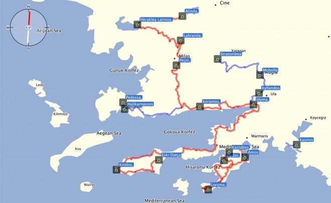 La voie Carienne se situe entre les villes d’Alinda au nord et d’Içmeler au sud. Une bonne partie du sentier longe la mer entre Keramos et les péninsules de Datça et de Bozburun. C’est d’ailleurs la portion la plus spectaculaire.