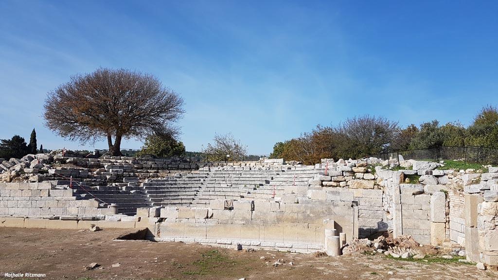 Un peu plus à l’est en continuant la promenade parmi les magnifiques oliviers, voici le superbe bouleutérion où se tenait le conseil des habitants gérant les affaires administratives de la ville. Du haut des gradins, les pierres de l’agora qui se mêlent à la végétation environnante offrent une perspective mystique.
