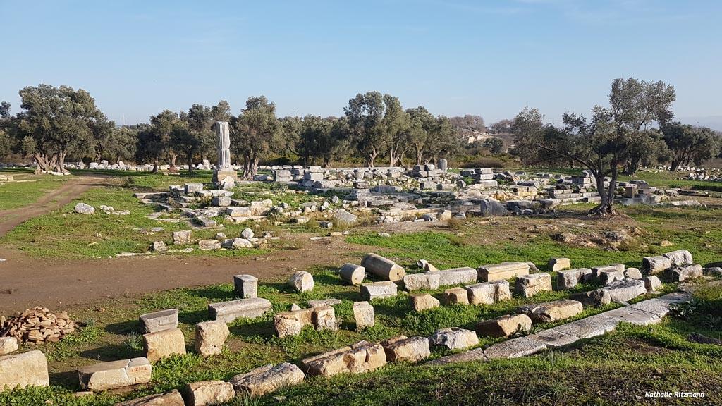 Dionysos fut le dieu principal honoré à Teos et le célèbre architecte grec Hermogène fut chargé de construire là le temple le plus vaste érigé à sa gloire. Les travaux réalisés actuellement ne permettent pas d’approcher les vestiges dudit temple mais la vue du chemin donne une idée de l’ampleur de la réalisation.