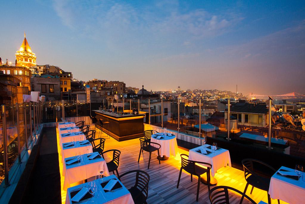 En été, ils enlèvent le rideau sur la porte de l'escalier ce qui rend la situation moins ambiguë. La terrasse en plein air est magnifique. Elle surplombe la Corne d'or offrant une vue spectaculaire sur les mosquées éclairées. Autour, vous pouvez profiter d'une vue à 360 degrés sur Istanbul. La terrasse ne doit faire pas plus de 200 m2 privilégiant une ambiance assez intimiste. La musique est plutôt de bonne qualité et les gens dansent vraiment, les cocktails aussi sont bons et bien dosés. Un des barmans est un Grec qui s'appelle Panos, il est plein d'humour et adore parler. Si vous vous y rendez n'hésitez pas à lui taper la discute, après deux ou trois minutes de conversation, il vous offrira surement des shots. Vous pouvez aussi prendre une table si vous êtes nombreux, elles offrent toutes une vue magnifique sur la ville, et les banquettes sont très confortables. Ce que j'aime à Zeldazonk c'est que la clientèle n'est pas prétentieuse, elle est venue s'amuser et non se montrer. En semaine c'est un endroit sympa pour venir boire un verre et y admirer la vue.