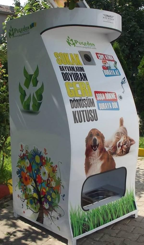 La société turque Pugedon, basée à Sakarya (région de Marmara), a décidé d'?uvrer en faveur des animaux errants et a élaboré une machine permettant de leur distribuer à manger et à boire tout en mettant les citoyens à contribution. Le principe est simple et propose un résultat immédiat : les habitants sont invités à déposer leurs bouteilles en plastique dans la machine. Pour chaque bouteille insérée, de l'eau et de la nourriture tombent dans les gamelles situées en dessous. Ces distributeurs ont été déposés dans différents endroits de la ville, en particulier dans les espaces verts et lieux publics (dans les arrondissements stambouliotes de Be?ikta? et Kartal en particulier). L'opération a commencé au mois d'avril et s'est déjà étendue à d'autres municipalités du pays (Bodrum, Izmir Kar??yaka, Eski?ehir, Gaziantep, Bursa Nilüfer, Çanakkale Biga, Bart?n Amasra).
