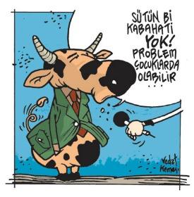 Ces propos officiels n'ont pas suffi à convaincre les médias, qui citent divers experts selon lesquels la thèse d'un ?empoisonnement? du lait n'est pas à écarter. Dans la caricature ci-dessus, Vedat Kemer prête à une vache en habits de ministre les propos suivants : ?Le lait n'est pas fautif ! Le problème peut venir des enfants?? Muharrem Ince, député du Parti républicain du peuple (CHP), ironisait sur le même ton en déclarant hier que l'AKP au pouvoir pourrait bien aller jusqu'à ?rendre les vaches responsables de la situation".