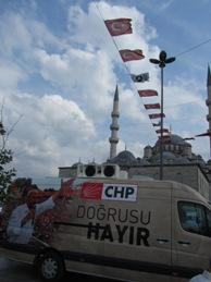 Impossible de ne pas remarquer la campagne en cours pour le OUI (AKP) ou le NON (CHP notamment) : gigantesques affiches, camionnettes hurlantes dans toute la ville, parade de la corporation des pêcheurs sur le Bosphore… Istanbul vit à l’heure du référendum. La bataille électorale entre les partis politiques fait donc rage avant la date fatidique du 12 septembre (également date anniversaire du coup d'Etat de 1980 !) d’autant que, pour beaucoup, cette élection est un test grandeur nature avant les élections législatives de 2011.