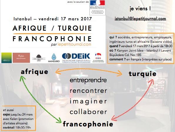 Vendredi 17 mars à 18h30 au Joint Idea Kanyon, un espace de rencontres et de travail situé sur l’incroyable terrasse du centre commercial Kanyon à Levent, changement de genre : lepetitjournal.com d’Istanbul prend l’initiative d’un premier événement mettant en valeur “La francophonie comme facilitateur d’affaires entre Afrique et Turquie“ et intitulé “Afrique/Turquie-Francophonie“.