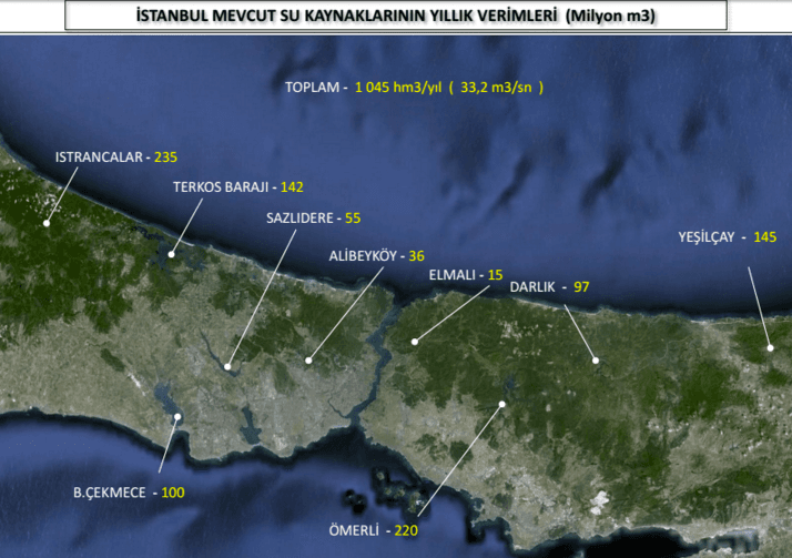 Face à cette demande, Istanbul ne peut plus compter sur ses propres ressources. “La ville compte sept bassins naturels, qui représentent une surface totale de 3.000 km2, explique Ahmet Doğan, ingénieur en hydraulique et hydrologie, enseignant à l’université Yıldız. Si nos barrages sont pleins, s’il tombe 800 millimètres de pluie par an – ce qui est la quantité moyenne – alors en théorie, Istanbul a suffisamment d’eau pour répondre à ses besoins. En pratique, nous vivons régulièrement des années de faibles précipitations. Dans ce cas-là, les bassins d’Istanbul ne suffisent plus.”