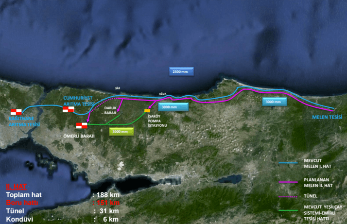 A ce stade du projet, la rivière Melen (dans la province de Düzce) fournit déjà à Istanbul jusqu’à 700.000 mètres cubes d’eau par jour. La rive européenne profite de cet apport grâce à un tunnel sous le Bosphore. Mais à l’été 2014, cela n’a pas suffi. Istanbul a dû puiser dans une autre rivière voisine, celle de Sakarya, dont l’eau présente l’inconvénient d’être de moindre qualité et donc plus coûteuse à traiter.
