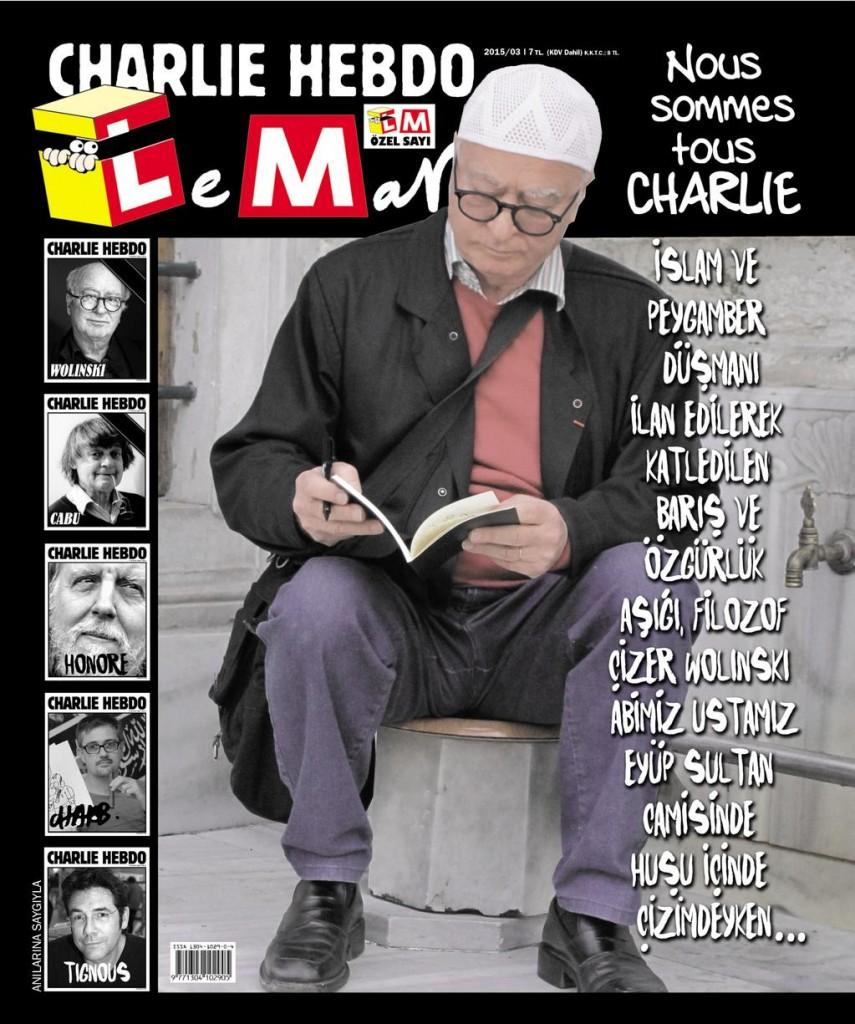 Pour illustrer la couverture d’un numéro spécial paru ce lundi 12 janvier, la rédaction du magazine turc a choisi une photographie de Georges Wolinski. Prise en 2002, alors que l’équipe de Charlie Hebdo se trouvait en Turquie, celle-ci montre le très prolifique caricaturiste arborant une taqiya - ou calotte - en train dessiner devant la mosquée d’Eyüp Sultan, à Istanbul. À droite du cliché, une légende témoigne de l’affection de l’ensemble de la rédaction à celui qui fut leur "maître et grand frère, le philosophe et dessinateur Wolinski, amoureux de la liberté et de la paix, étiqueté comme ennemi de l'islam et du prophète". Pour l’anecdote, ce serait Georges Wolinski lui-même qui aurait offert l’image à ses confrères turcs comme "souvenir de l’un de ses nombreux voyages à Istanbul".