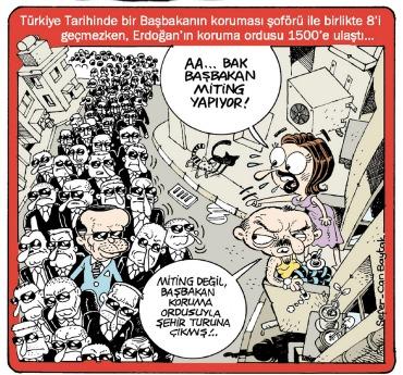 Le quotidien d’opposition Sözcü l’affirmait début octobre : le Premier ministre Recep Tayyip Erdoğan aurait à sa disposition une équipe de 1.500 gardes du corps. Info ou intox, le sujet a inspiré Can Baytak, qui livre cette caricature à l’hebdomadaire satirique Leman