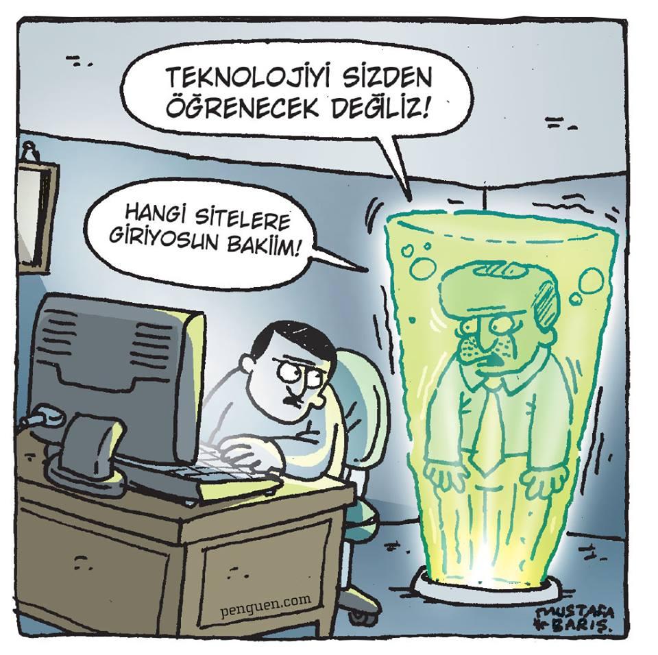 Dans son dernier numéro, l’hebdomadaire satirique Penguen publie une caricature du dessinateur Mustafa Barış. On y voit le Premier ministre turc, Recep Tayyip Erdoğan, sous la forme d’un hologramme, debout derrière un citoyen en train de surfer sur le net. Une allusion ironique à son apparition “numérique” lors de son dernier meeting, et, en filigrane, une critique de la nouvelle loi de contrôle d’internet.