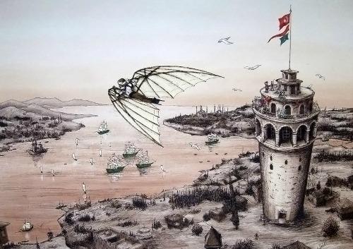 Le ?savant fou?, sans doute inspiré par la machine volante de Léonard de Vinci, aurait pris à la lettre l'adage populaire ?voler de ses propres ailes? en s'élançant, dès 1632, du haut de la tour de Galata, soit de 63 mètres. Porté par deux ailes mécaniques qu'il avait lui-même confectionnées, il serait parvenu à planer au-dessus du Bosphore, terminant ? sain et sauf! ? sa course intrépide dans le quartier d'Üsküdar, situé sur la rive asiatique d'Istanbul.