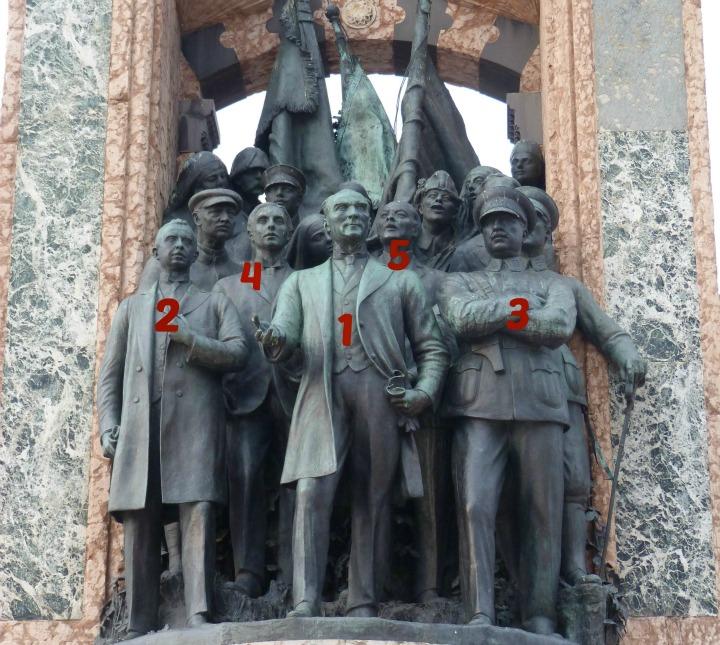 Mustafa Kemal Atatürk (1), commanditaire de l’œuvre sculptée par l’italien Pietro Canonica, occupe une place centrale, entouré par ses bras droits Ismet Inönü (2) et Fevzi Çakmak (3). Le monument présente d’un côté Atatürk et ses compagnons d’armes pendant la guerre d’Indépendance, et de l’autre le Président Atatürk, entouré de personnages habillés à l’occidentale. C’est justement sur ce côté symbolisant le nouvel Etat et la sérénité retrouvée que l’on remarque deux figures presque inconnues de tous : deux soldats de l’Union soviétique. Aucune plaque, aucune indication ne permettent d’identifier formellement les personnages autres que les trois centraux. Alors qui sont ces deux soldats et par quelle légitimité peuvent-ils ainsi trôner place Taksim ?