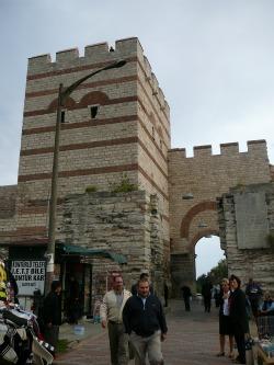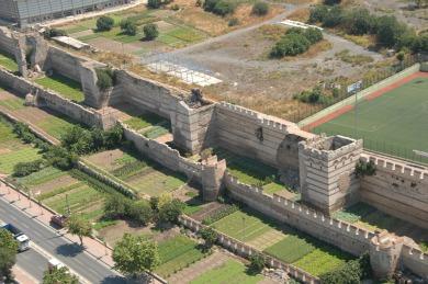 Işık Aydemir (photo personnelle): Leur construction a commencé en 413, sous l’ordre de l’empereur Théodose II. Il s’agit d’un système de fortification unique dont la tradition remonte à l’ancienne Egypte, aux Hittites, à Babylone. Jusqu’à la fin du Moyen-Âge, ces fortifications sont restées les plus sophistiquées du monde. Les murailles construites par Théodose II forment en quelque sorte un triangle. Deux côtés du triangle suivent la mer de Marmara et la Corne d’Or : il s’agit des remparts maritimes. A l’est, reliant la mer de Marmara à la Corne d’Or, s’élèvent les remparts terrestres d’une longueur de sept kilomètres. Les murailles sont en réalité une construction en trois parties successives : une muraille principale de 4,80 mètres de large et de 11 à 14 mètres de haut, 96 tours, 10 portes principales, un avant-mur lui aussi flanqué de tours et un fossé. La muraille – parties terrestre et maritimes réunies – mesure 26 km.