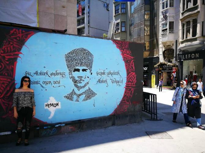 Une passante se fait photographier devant une représentation d'Atatürk.