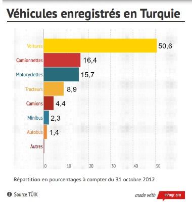 Avec plus de 905.137 nouveaux véhicules enregistrés entre janvier et octobre, dont 86.000 pour ce seul dernier mois, le nombre total de voitures, camionnettes et autres motos en Turquie s'élève officiellement à 16,9 millions. Parmi eux, les voitures restent reines de l'asphalte puisqu'elles représentent 50,6% du total des véhicules. Le reste se répartit comme indiqué sur le graphique ci-contre.
