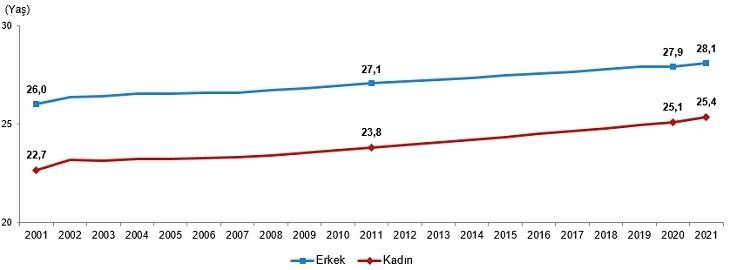 Si l’on observe l’âge de célébration du premier mariage en Turquie sur les 20 dernières années, on constate en 2021, que l’âge moyen est de 28,1 ans pour les hommes (26 ans en 2001, 27,1 ans en 2011), et de 25,4 ans pour les femmes (22,7 ans en 2001, 23,8 ans en 2011).