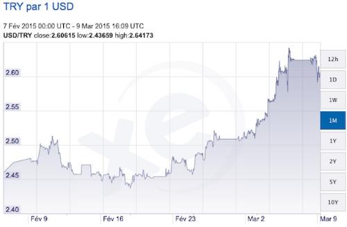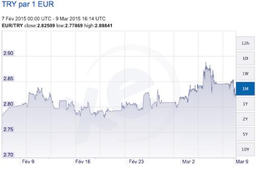 Ces dernière semaines, la dépréciation de la livre turque (TL) face au dollar américain (USD) s'est accélérée, un dollar s'échangeant désormais contre 2,647 TL, rapporte le quotidien Today's Zaman. Un taux historiquement bas pour les experts, alarmés par la crispation croissante des marchés. De même, la valeur de la livre turque a fortement baissé par rapport à l'euro (?) : 1 euro s'échange ces jours-ci pour 2,87 TL. Le bras de fer engagé depuis plusieurs mois entre le président turc Recep Tayyip Erdo?an et la Banque centrale de Turquie (TCMB) au sujet des taux directeurs décidés par cette dernière n'aide vraisemblablement pas à enrayer ces chutes.