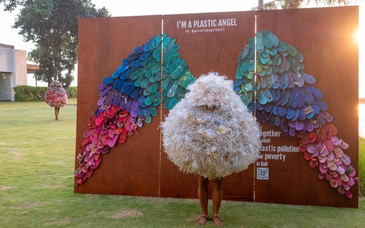 Les toiles et sculptures de l’exposition, toutes créées à partir de matériaux plastiques collectés à la décharge de Suwung et dans les rivières balinaises, offrent un éventail varié de médias : illustration, pochoir, peinture, collage, photo... En arrivant sur les lieux, le visiteur est accueilli par une gigantesque paire d’ailes crées avec des tongs recyclées, triées par couleur et formant un vaste dégradé arc-en-ciel. On découvre aussi une sculpture d’un mètre soixante-dix de haut, représentant le visage de Talitha, 9 ans, fabriqué en lanières multicolores d’emballage tressées ensemble. Plus loin, les artistes Plastic Bubbles dansent sur la pelouse de l’hôtel, vêtus de costumes élaborés à partir d’emballages plastiques, façonnés en forme de cocons, grelots aux chevilles, en une chorégraphie espiègle. Chaque œuvre réinterprète le portrait d’un enfant et lui donne voix. Un cartel et un QR code renseignent le visiteur sur son nom, son âge, son histoire, ses rêves, en somme, son individualité. Il est aussi possible d’apporter son soutien à un enfant en le parrainant. En plaçant l’humain au cœur de ce travail artistique collectif, l’action concrète se trouve alors à portée de main.