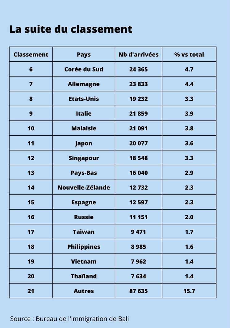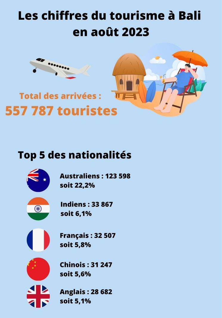 Les français arrivent à la troisième place, représentant presque 6% des touristes totaux. Premier pays européen avec 32 507 visiteurs pour le mois d'août, le nombre de touristes français est en augmentation de près de 12% par rapport à juillet. L'année dernière, à la même période, on comptait à peine 20 000 touristes français sur l'île. Cette augmentation significative confirme que les français sont à nouveau prêts à voyager loin de chez eux et que Bali reste parmi leurs destinations les plus prisées.