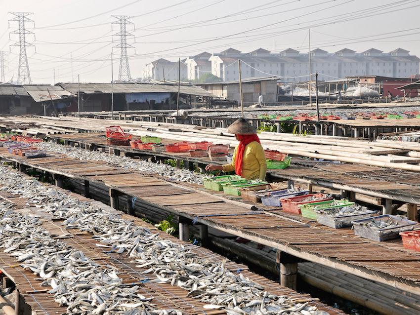A Muara Angke, le marché aux poissons situé au nord de Jakarta, les ouvrières nettoient les poissons dans l'eau salée, les étalent sur d'immenses tables de bambou où ils sèchent en plein soleil.
