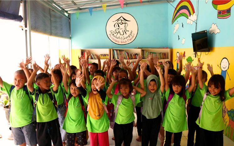 Pour accéder à la Yayasan Saja, il faut s’enfoncer dans une petite ruelle d’un kampung situé au nord de Jakarta, dans un quartier populaire à proximité de Kota Tua. Les cris joyeux d’enfants s’élèvent derrière un large portail siglé du logo de la fondation : « École et centre créatif Saja. Pour rendre les enfants autonomes. » L’école, aménagée dans un ancien entrepôt d’environ 200 m², se compose d’une cour avec quelques jeux pour enfants et d’un espace ouvert abrité par un toit où sont donnés les enseignements.