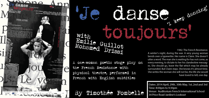 Après le succès de Ils s'aiment au café-théâtre, Emillie Guillot, actrice et directrice de la Hong Kong Theatre Association, interprète avec le danseur et chorégraphe Mohamed Drissi Je danse toujours de Thimothée de Fombelle, une pièce poignante qui raconte l'histoire de Claire, une femme qui par patriotisme et par amour choisit la Résistance dans une guerre qui lui vole pourtant sa vie et ses possibles.