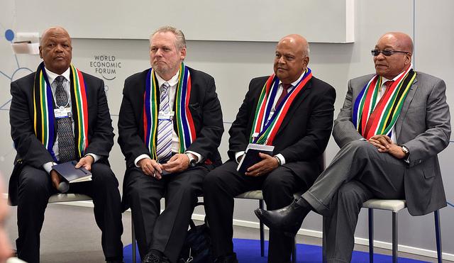Crédit photos : Photo du haut, de droite à gauche : Président Jacob Zuma avec le ministre des finances Pravin Gordhan, le ministre de l'industrie Rob Davies and ministre de la Présidence Jeff Radebe durant the Business Interaction Group on South Africa au Forum Economique Mondiale à Davos, Suisse. (Photo: GCIS), Photo de l'encadré : Quinn Dombrowski/flickr