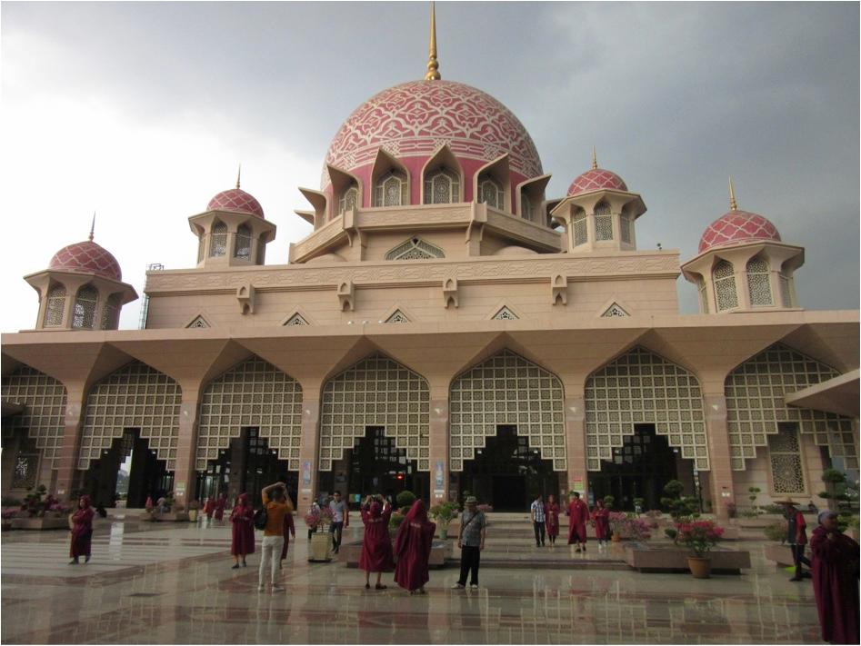 Surplombant la ville de son dôme, la mosquée rose est quant à elle la première mosquée de Putrajaya. Son emplacement est tout aussi important, elle borde le lac et avoisine les bureaux officiels du Premier ministre. Sa construction a été lancée en 1997 pour s'achever deux ans plus tard, un projet d'envergure qui a coûté au total 250 millions de ringgits.