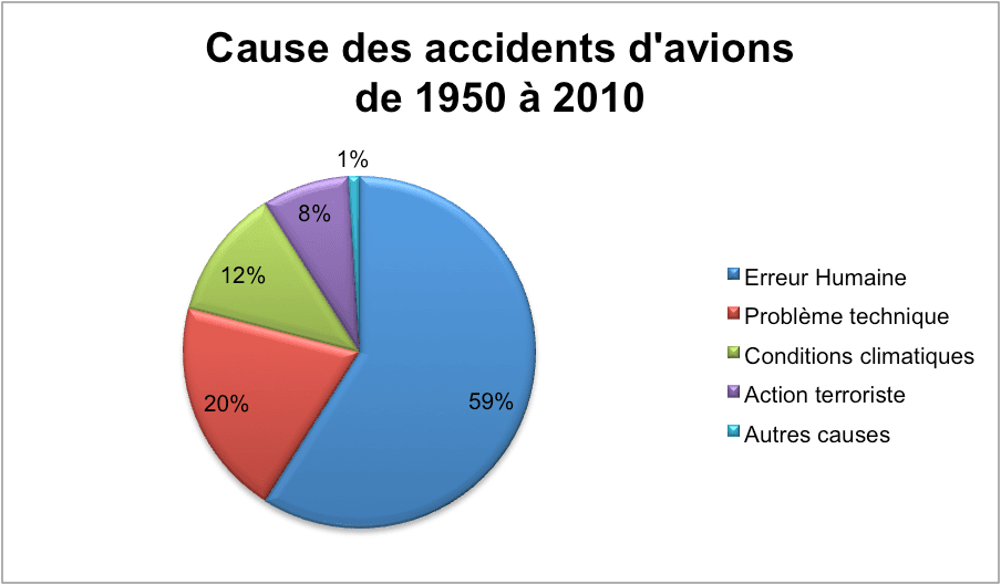 L'erreur humaine est le premier facteur de crash entre 1950 et 2010. Il n'est malheureusement pas possible de dire que le taux de crashs dus à une erreur humaine a baissé depuis 1950. Certes, les formations sont meilleures. Mais si le nombre d'accidents aériens a diminué, le nombre d'erreur a diminué dans les mêmes proportions. Ainsi, entre 2005 et 2011, sur 435 accidents recensés dans le monde, 207 sont la conséquence d'une erreur du pilote. L'exemple le plus emblématique reste surement le vol Rio-Paris, le 1er Juin 2009. Selon René Amalberti, expert européen qui s'exprimait dans le journal Le Monde, l'erreur humaine ne pourra jamais disparaître complétement. Bien au contraire. "Les types de pilotes sont de plus en plus disparates, bien ou mal payés, issus du monde développé ou non, avec des subtilités de formations différentes. Ces différences d'approches peuvent constituer autant de petits grains de sable face à la machine?. Le schéma de l'aviation est l'illustration parfaite des inégalités entre les pays développés et les pays en développement, qui n'ont pas toujours la même vision de la sécurité.