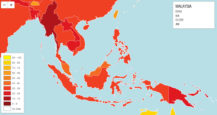 Au sein du classement de l'organisation qui mesure chaque année la perception de la corruption dans le monde, le Malaisie se classe 65 sur 176 Etats évalués. Elle recueille la note moyenne 49 points sur une échelle graduée de 0 (corruption perçue la plus forte) à 100 (corruption perçue très faible). En Asie du Sud-Est, l'élève modèle demeure Singapour classé à la 5e place, suivi de Brunei (46e) et la Thaïlande (88e). Le reste des pays de la région peuvent être montrés du doigt pour leurs rangs à trois chiffres, avec une Birmanie "bonnet d'âne" à la 172e place.