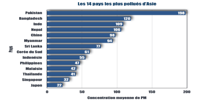 Dans son rapport de 2014, l'Organisation Mondiale de la Santé (OMS) affirmait que la pollution de l'air serait responsable d'une mort sur huit au niveau mondial et aurait causé le décès de plus de sept millions de personnes en 2012, dont 65% en Asie. Même s'il est indéniable que la région de l'Asie du Sud-Est est une grande émettrice de pollution, mais aussi l'une des plus affectées par cette dernière, la Malaisie se situe relativement bas dans le classement. En effet, le pays arrivait en 2012 au 11ème rang sur 14 des pays les plus pollués d'Asie, avec une concentration moyenne de 42PM*. Tel que l'illustre le graphique ci-dessous, s'appuyant sur des données du rapport de l'OMS. Le Pakistan et le Bangladesh occupent quant à eux les deux premières places du classement, avec des moyennes respectives de 198PM et 120PM, alors que les trois derniers rangs sont occupés par la Thailande, Singapour et le Japon.