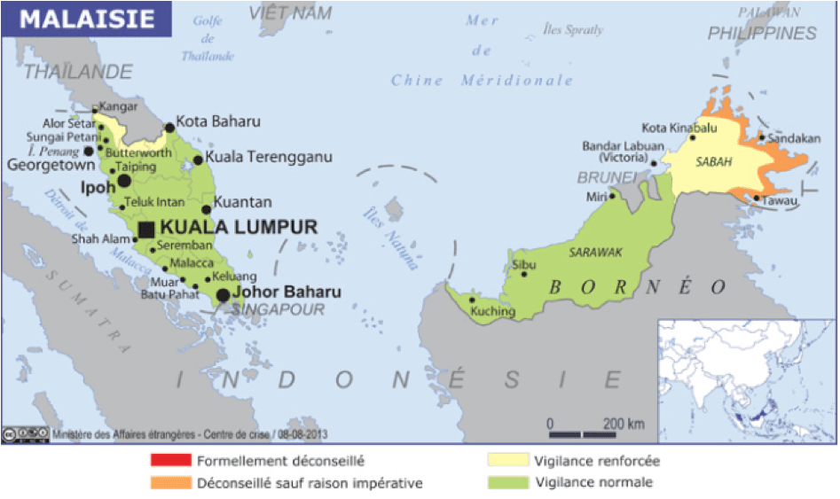 - Par ailleurs, il a durant longtemps été conseillé de faire preuve d'une vigilance renforcée quant à d'éventuels déplacements dans le Sabah, situé sur la partie nord de la Malaisie Orientale. Les récentes séries d'enlèvements perpétrés à, et au large de Lahad Datu, ainsi que l'incursion d'insurgés Philippins en début d'année dernière, ont fait des côtes Nord et Est du Sabah, des zones ?déconseillées, sauf pour raison impérative?. De part sa proximité avec des îles philippines où seraient présentes des cellules du mouvement séparatiste islamiste, Abu Sayyaf, ainsi que des dernières tentatives d'intrusions, il reste conseillé de ?maintenir une vigilance renforcée lors de déplacements dans le reste de l'Etat du Sabah et d'éviter les îles voisines des Philippines?.