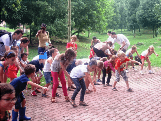 Ayant reçu un collier en forme d'?uf sur lequel se trouvait un animal, chaque enfant a du retrouver son équipe en poussant le cri de l'animal représenté. Voilà qui a donné lieu à un joli moment cacophonique digne d'une chorale fermière imaginaire : chiens, chevaux, vaches, singes, poules et chèvres s'étant retrouvés, les jeux ont pu démarrer.
