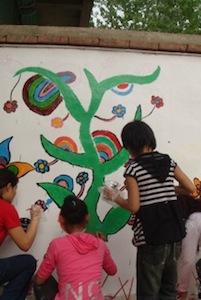 Nous sommes 12 personnes, dont 4 enfants et ados. On se connaît à peine mais une nuit dans le train suffit à briser la glace. Pas très réveillés, nous voilà embarqués dans des vans qui finissent par rejoindre un chemin cahotant et poussiéreux. Encore quelques secousses et nous arrivons dans une école ou les enfants et de nombreux grands parents du village sont rassemblés. Un peu intimidés par ce comité d'accueil, nous faisons connaissance avec les enfants de la Fondation. Notre tâche de l'après midi consiste à repeindre ensemble le mur d'enceinte de la bibliothèque. Sous la houlette bienveillante de notre guide Cécile, qui parle aussi allègrement chinois qu'anglais et français, nous devenons tous des artistes en herbe. Puis, nous nous rendons dans la maison que la Fondation a aménagé pour les enfants que les familles ne peuvent pas accueillir. Un des anciens protégés de Chi Heng y travaille désormais, comme au bureau local de la Fondation où l'on compte 4 anciens parmi les 5 permanents. Un passage de relais qui en dit long.